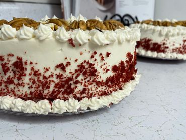 A red velvet layer cake covered with cream cheese flavored frosting.